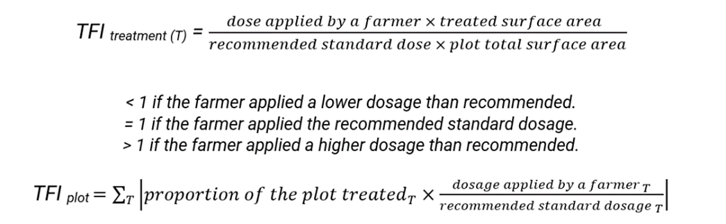 Implementing such an index in the Laotian context poses substantial challenges. In France, TFI calculations are typically derived from farm records, where a comprehensive database contains registered doses for all commercial products used in various applications (product x crop x treatment method x target). This allows farmers to calculate their TFIs independently.