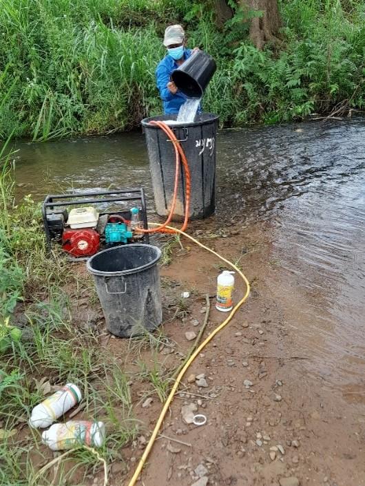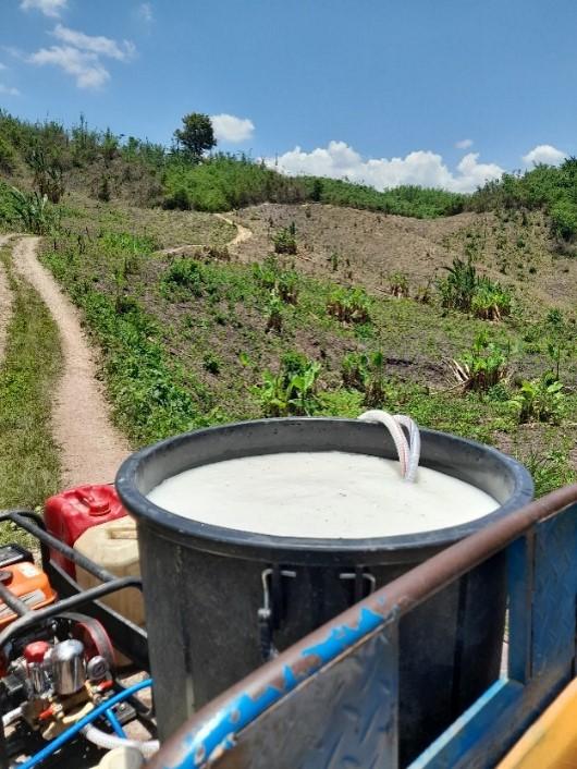 Figure 2 – Observation of herbicide application with motorised pumps. The left panel shows a labourer from a village in Namor District hired to prepare a selective herbicide mixture containing atrazine and mesotrione compounds. His remuneration was based on the number of bottles he diluted, at a rate of KIP 50,000 (approximately USD 2.50) per bottle. Working for an average of 5 to 7 farmers per season, this villager reported earning up to KIP 500,000 (around USD 25) per day, which equals 10 bottles or bags of herbicide products. The right panel shows the container typically used for herbicide spraying in maize fields, with a theoretical capacity of 200 liters. This farmer, who resides in another village within Namor District, employed a dilution ratio of 800 milliliters of herbicide to 360 liters of water. Variations in spraying practices, especially dilution ratios, may be influenced by factors such as plot accessibility and the presence of water storage points (Source: CCL; Namor District, June 2023, and May 2023).