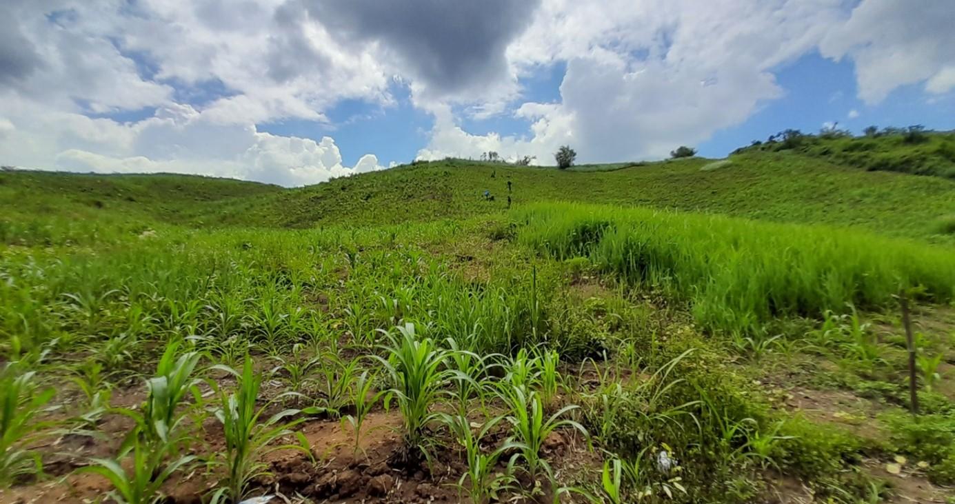 Figure 3– Observation of herbicide application with an electric backpack sprayer. The above left and right panel show a farmer from a village in Namor district preparing a selective herbicide mixture containing atrazine and mesotrione compounds. As depicted in the pictures, plastic containers of orange juice – a popular beverage among the youth in the villages of northern Laos – are often reused for the dosing of pesticide products. The observed farmer employed a dilution ratio of 160 milliliters of herbicide to 17 liters of water (i.e., one orange juice cup to one backpack sprayer). The below panel shows the outline of the farmer as he dispersed his herbicide mixture across his maize field. (Source: CCL; Namor District, June 2023).