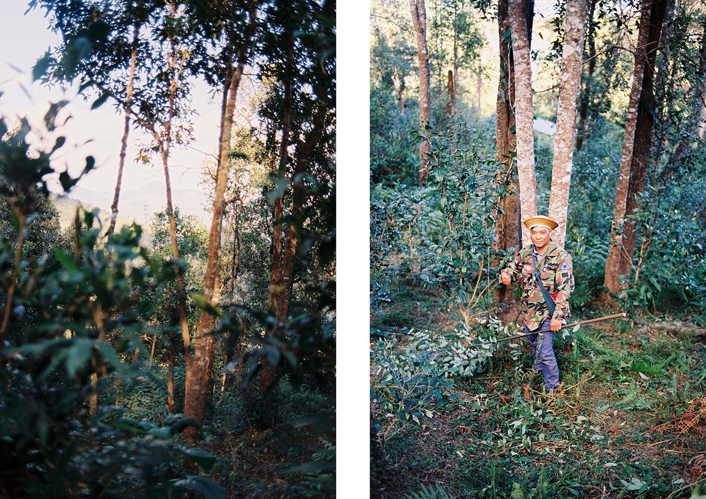 View of the agroforestry gardens of members of the Nyot Ou Tea Cooperative, Nyot Ou District, Phongsaly Province. On the right, Hougkeo, CCL staff and also tea producer from Nyot Ou district.